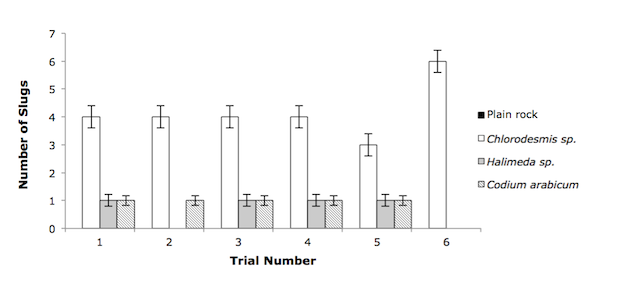 The experiment itself was limited by a small sample size, time constraints, and a lack of controlled repeatability of treatments. As each habitat structure (treatment) was different in each experimental dish, I could not control for any extra chemicals, bacterial or microalgal communities previously existing in and on the habitat structure that may have influenced the preference of slugs. It is likely that the small sample size of this experiment may have influenced the non significant result. Furthermore, even though animals were left alone as much as possible, and despite the use of the pipette technique for transporting them, it is probable that the animals were under a degree of stress. Future studies should conduct experiments with a much larger sample size, and use Bryopsis and Codium species.
