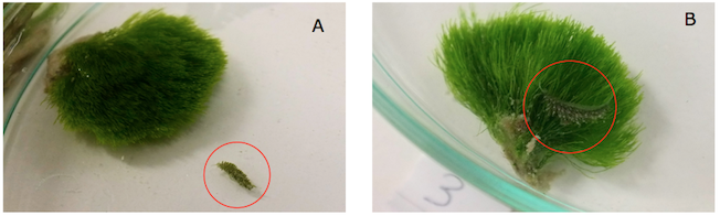 Photo (c): Placida dendritica approaching habitat structure 2, grass-like algae (A), and on habitat structure 2 (B). Slugs are circled in red. Photos taken by Alison Carlisle at the University of Queensland Heron Island Research Station.