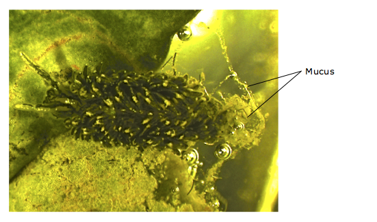 Photo (a): Placida dendritica specimen, which is camouflaged against the algae it is sitting on, and is secreting mucus (labelled). Photo taken by Alison Carlisle at the University of Queensland Heron Island Research Station.
