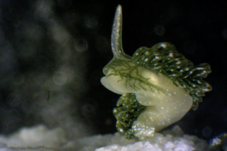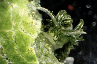 Placida dendritica, like all sacoglossans, is a specialist herbivore. This species has been found feeding on the macroalgae Bryopsis corticulans, Bryopsis pulmosa, Codium fragile, and Codium setchellii (Trowbridge, 1997). P.dendritica pierces holes in the algal cell walls using a specialised radula tooth (see Anatomy and Physiology tab: Radula), before sucking out the cell sap (Clark, 1975). This sap includes the algae's chloroplasts, which P. dendritica retains in its digestive epithelium (Marin & Ros, 2004). These chloroplasts, however, are not functional. Consequently, P. dendritica does not exhibit kleptoplasty, unlike a number of its close relatives (Evertsen & Johnsen, 2009). This sap-sucking method of feeding is characteristic of sacoglossans. P.dendritica moves around its algal host via wave-like contraction of its muscular foot. This crawling locomotion is aided by the secretion of mucus.