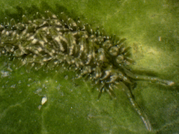 Despite its morphological similarity, Placida dendritica is not a nudibranch, but rather a species of sea slug belonging to the clade Sacoglossa. Sacoglossans are a group of opisthobranch gastropod molluscs, comprised of various sea slugs and sea snails. P. dendritica is very small (typically <1cm in length) and can be identified by its dorsal extensions known as cerata, and its colouration and patterning. This species has translucent skin with two defined digestive channels, which run the length of the body and connect to an extensive network of tributaries extending into the head, rhinophones and cerata. These channels range from a light to dark shade of green. P. dendritica is a specialist herbivore, feeding only on specific types of green algae.